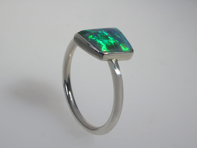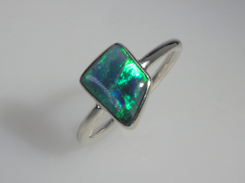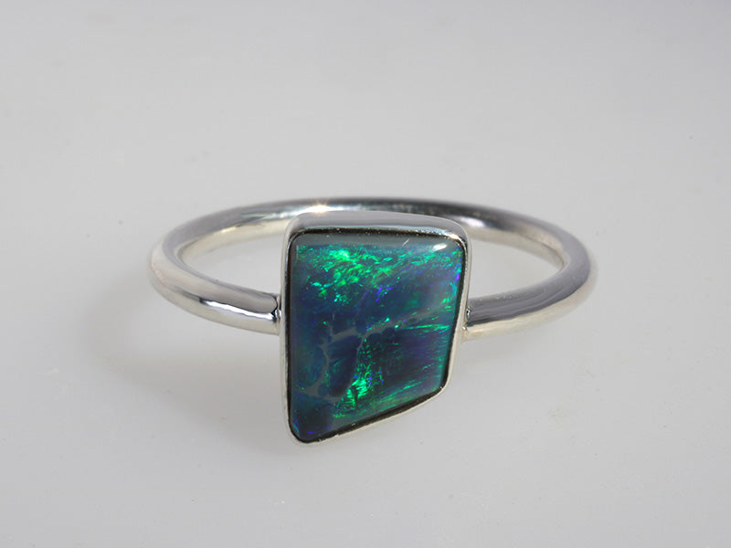 Anello in argento 925 con opale nero australiano taglio libero riflessi verdi e blu a volte molto intensi. Misura 13. Lavorazione fatta in Italia.