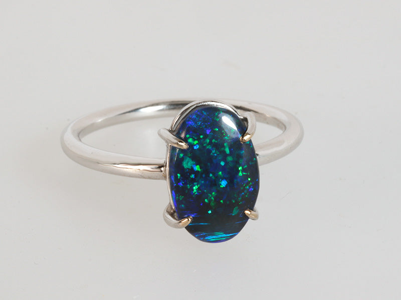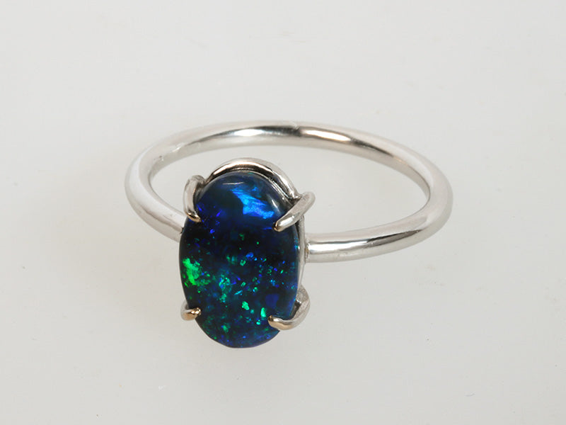 Anello in oro bianco 18k con un raro opale nero australiano taglio ovale dagli intensi riflessi verdi e blu. Misura 15. Lavorazione fatta in Italia.