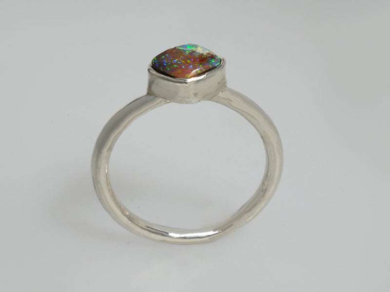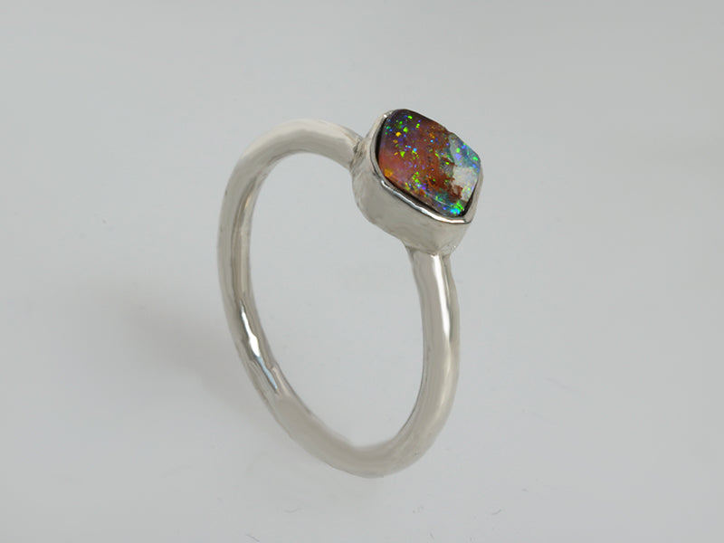 Anello in argentium 935 con opale boulder australiano dai  brillanti riflessi blu e verde. Il disegno minimal dell'anello risalta la bellezza naturale della gemma, creando un pezzo di pronto all'uso quotidiano. Misura 18 italiana. L'argentium non si ossida ed è anallergico.