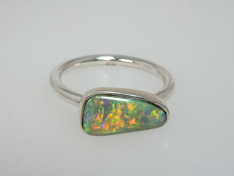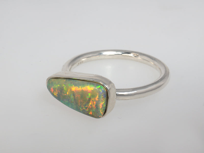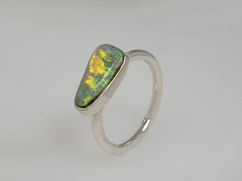 Anello in argentium 935 con opale boulder australiano dai brillanti riflessi multicolore. Il disegno minimal dell'anello risalta la bellezza naturale della gemma, creando un pezzo di pronto all'uso quotidiano. Misura 15 italiana. L'argentium non si ossida ed è anallergico.