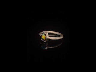 Anello in argentium 935 graffiato con opale boulder australiano dai brillanti riflessi multicolore. Il disegno minimal dell'anello risalta la bellezza naturale della gemma, creando un pezzo di pronto all'uso quotidiano. Misura 15 italiana. L'argentium non si ossida ed è anallergico.