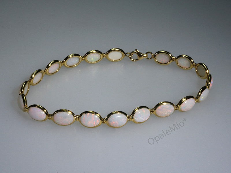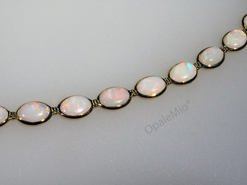 Bellissimo bracciale finemente lavorato in oro 18k con 19 opali bianchi australiani tutti con un piacevole gioco di colori. Lunghezza da 18,5 cm.