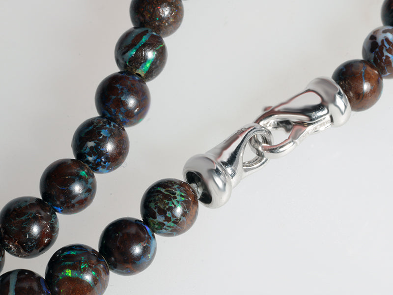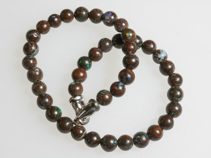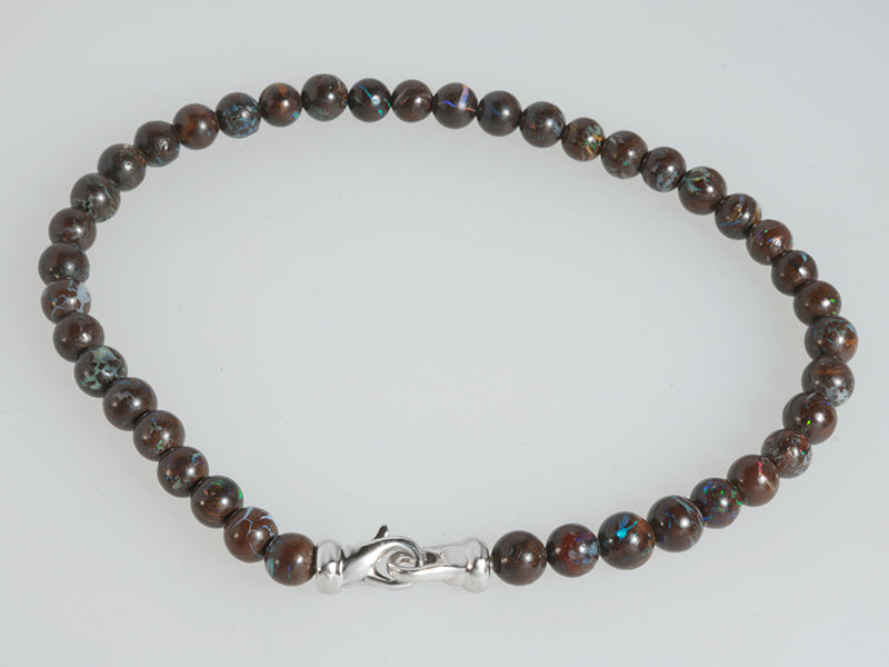 Bracciale raffinato con opali matrix australiani in taglio perla, caratterizzati da una molteplicità di riflessi cromatici che giocano sulla superficie delle pietre. La chiusura in argento 925 garantisce solidità e eleganza. Lunghezza 18,5, ma su richiesta è possibile aggiungere o togliere perline di opale