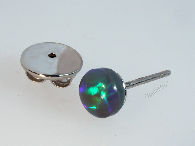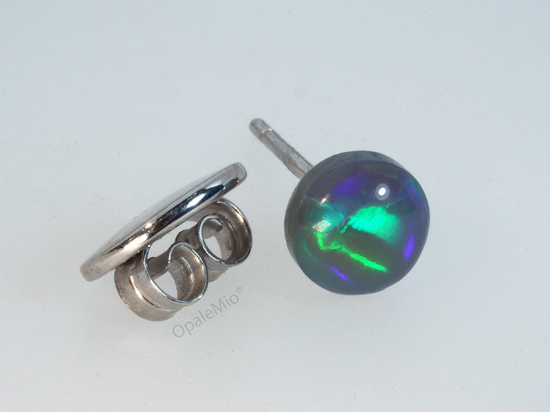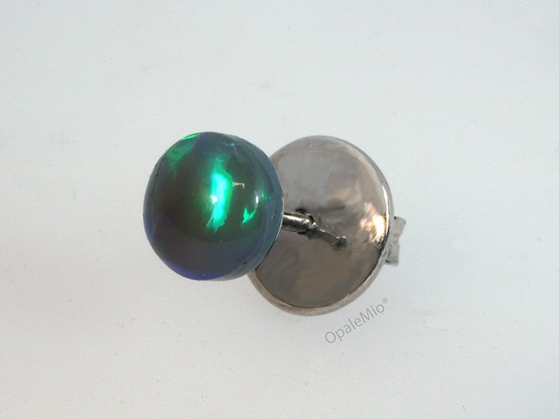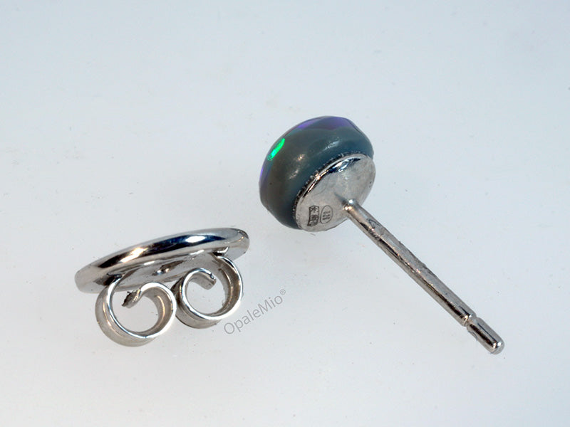 Collezione Coccole. Orecchino singolo punto luce in argento 925 e opale nero australiano taglio cabochon dai brillanti riflessi verdi e blu. OpaleMio design realizzato in Italia.