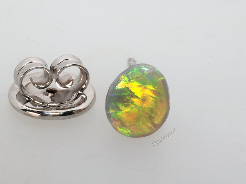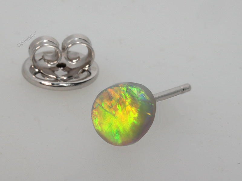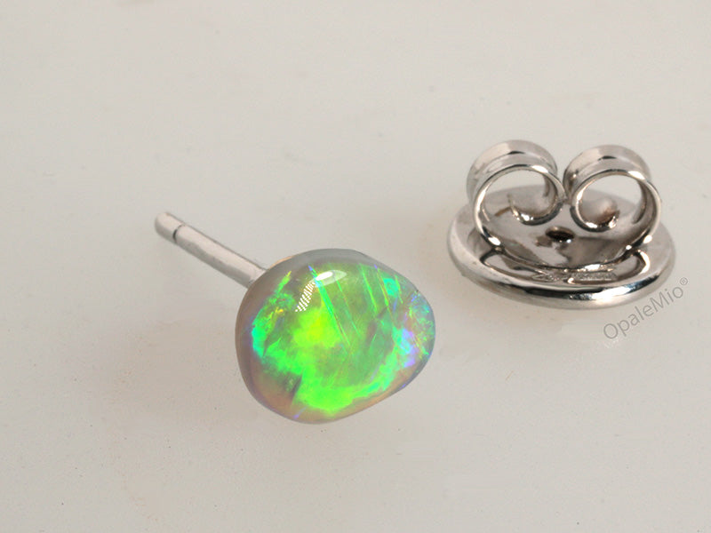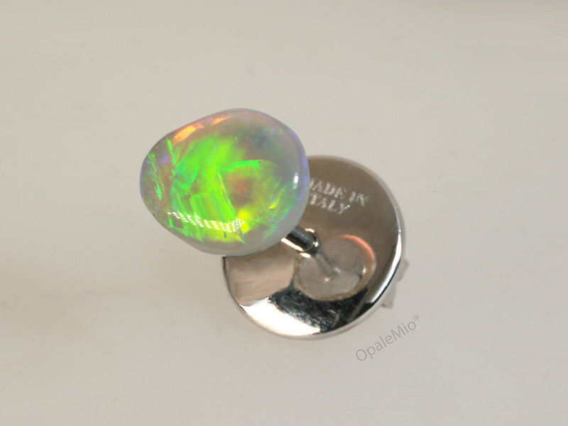 Orecchino singolo punto luce in oro bianco 18k e opale scuro australiano dai brillanti riflessi multicolore. OpaleMio design realizzato in Italia.