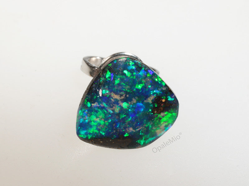 Info: roccia ospite. I colori possono essere estremamente vivi e brillanti, mentre nella classificazione l'opale boulder è identificato con Solido 2. Le miniere di opale boulder sono sparse nell'outback del Queensland e forniscono la totalità di questa preziosa gemma.