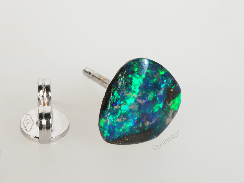 Orecchino singolo punto luce in oro bianco 18k e opale boulder australiano dai brillanti riflessi verdi e blu. OpaleMio design realizzato in Italia.