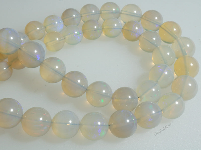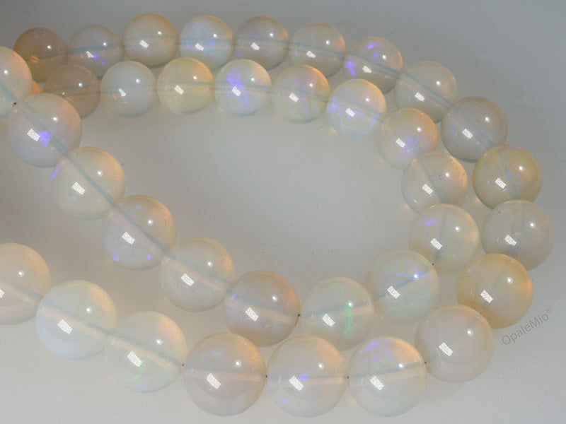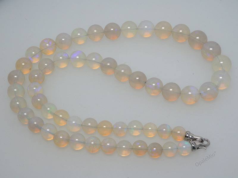 Collana di perle in opale crystal australiano con chiusura in argento 925. Le perle hanno una delicata piacevole colorazione azzurra con riflessi blu e verdi. Lunghezza 43 cm. Diametro perle da 6,15 a 9,60 mm