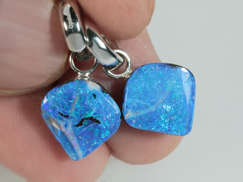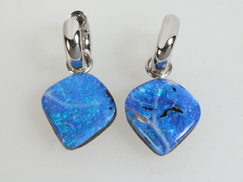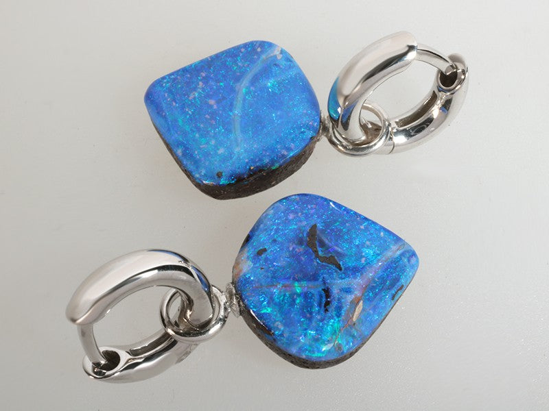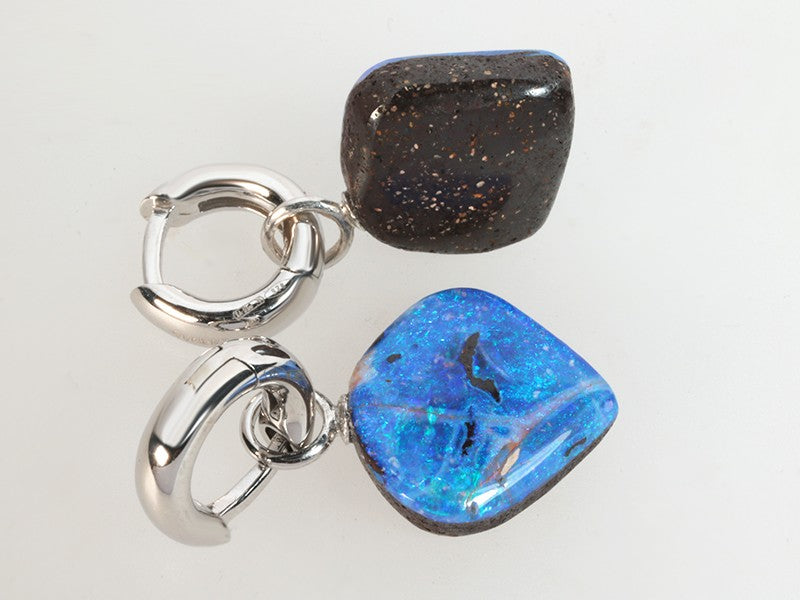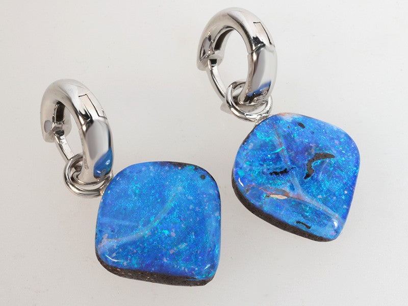 Orecchini in arg.925 con opali boulder australiani taglio libero dal brillante gioco di riflessi azzurri e blu che si evidenziano con qualsiasi luce. Diametro interno dell'orecchino a cerchio 6,35 mm. Su richiesta possiamo fornire l'orecchino a cerchio di diametro interno di 10,00 mm