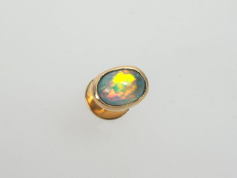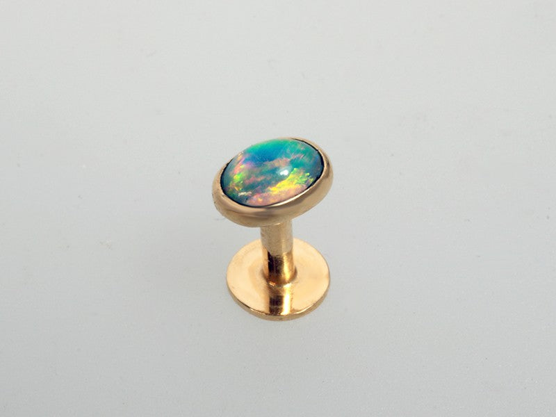 Collezione Praline. Orecchino piercing singolo punto luce in oro 18k e piccolissimo opale crystal australiano taglio ovale con riflessi molto brillanti e colori decisi. Lunghezza barretta 6 mm. OpaleMio design realizzato in Italia.