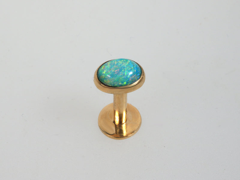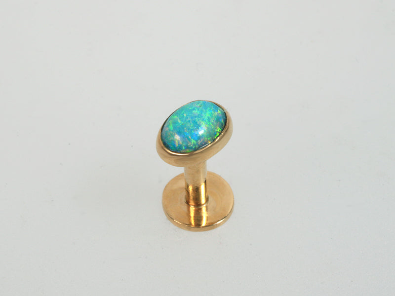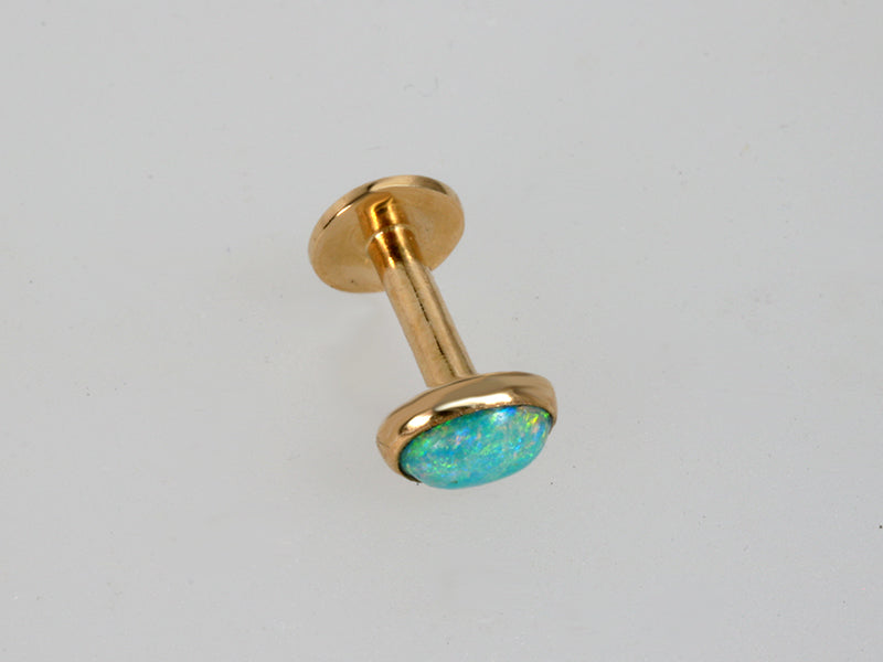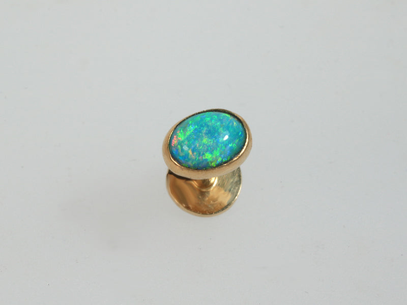 Collezione Praline. Orecchino piercing singolo punto luce in oro 18k e piccolissimo opale crystal australiano taglio ovale con riflessi molto brillanti e colori decisi. Lunghezza barretta 6 mm. OpaleMio design realizzato in Italia.