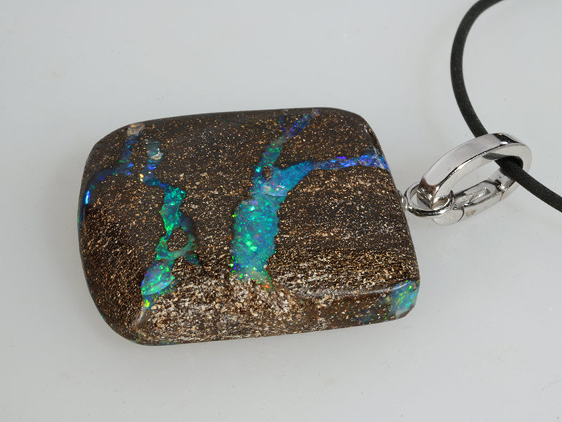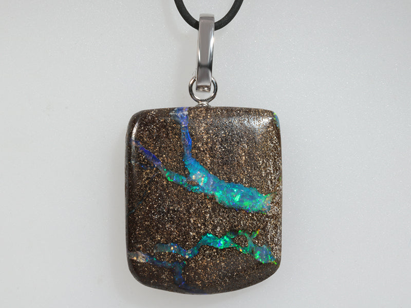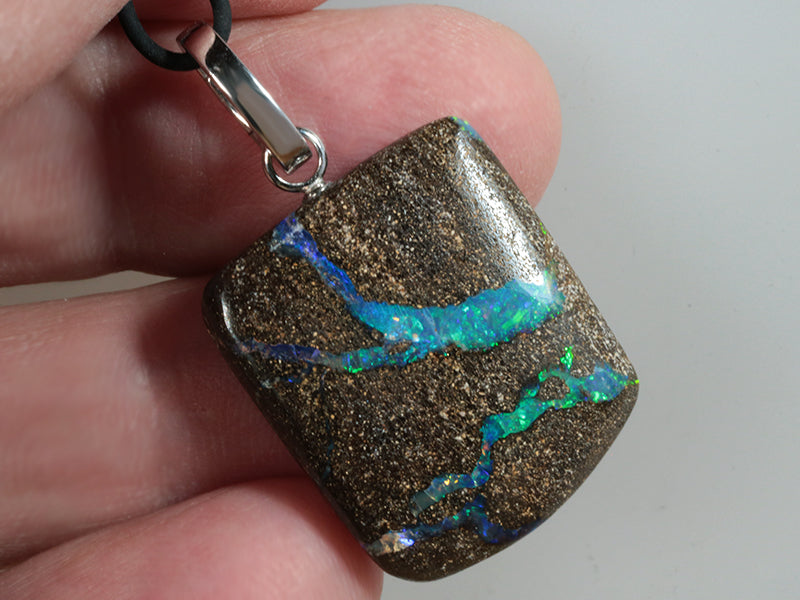 Pendente di opale boulder australiano con venature che evidenziano brillanti riflessi azzurri, blu e verdi. Chiusura charm in argento 925.