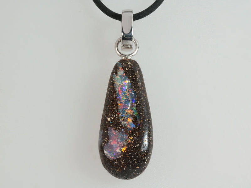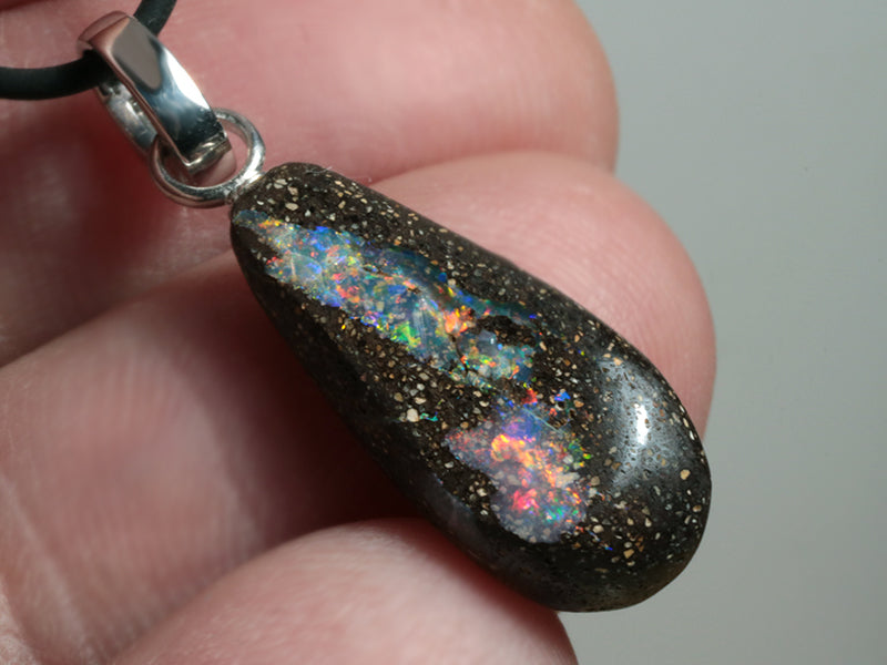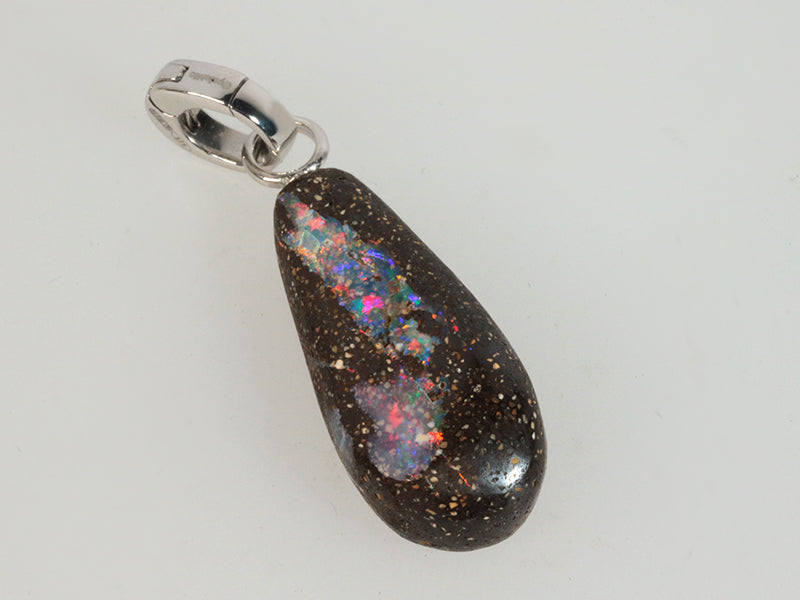 Pendente con opale boulder australiano dai bellissimi riflessi multicolore che risultano essere molto intensi e luminosi. Chiusura charm in argento 925.