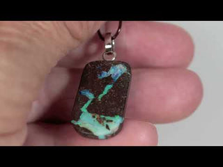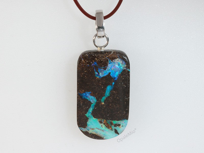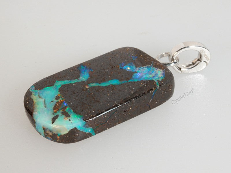 Pendente di opale boulder australiano con venature di colori intensi e riflessi a volte brillanti verdi e blu. Chiusura charm in argento 925.
