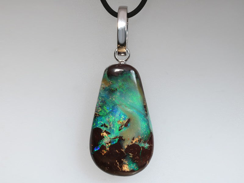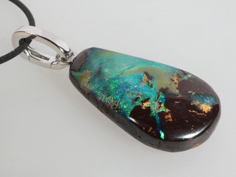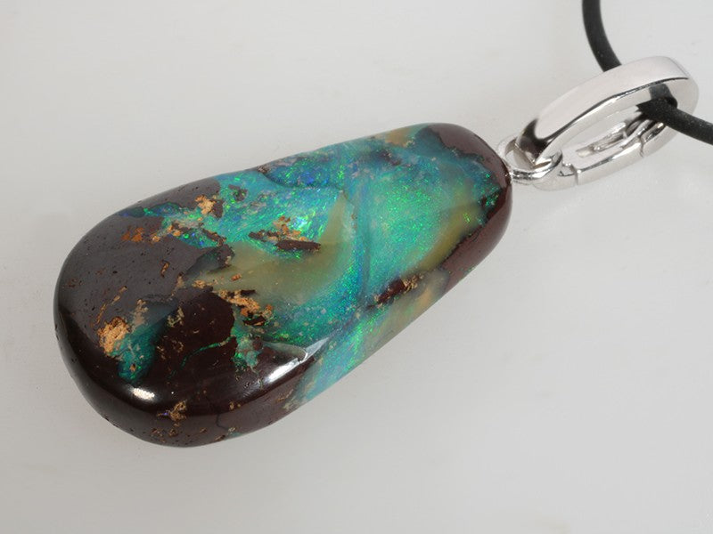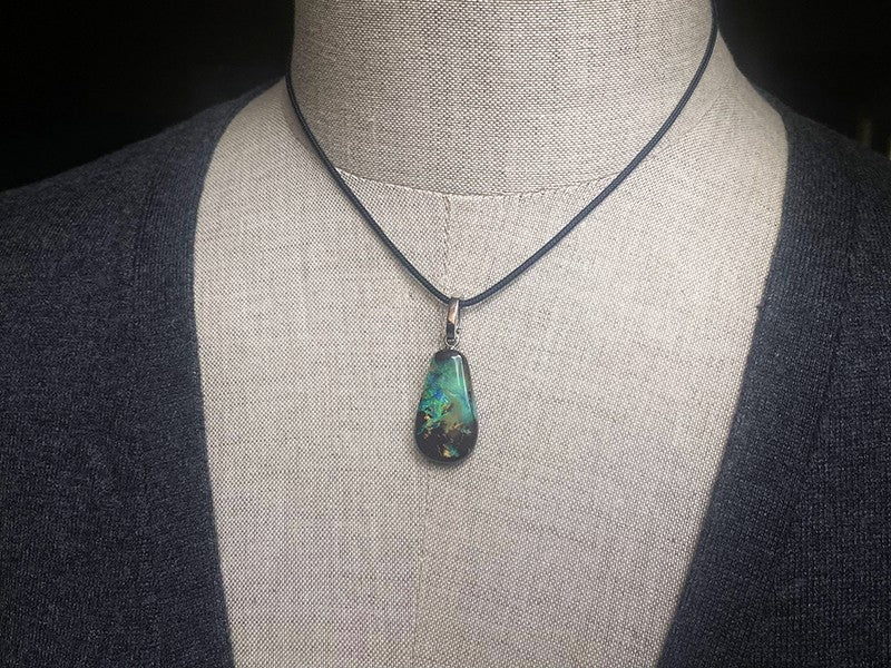 Pendente con opale boulder australiano dai colori densi e riflessi di tante tonalità di verde e blu sempre molto evidenti. Chiusura charm in argento 925.