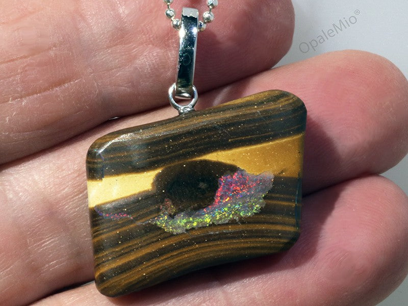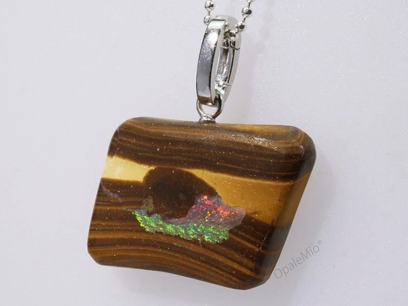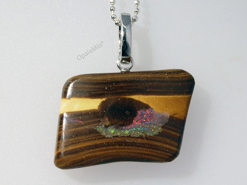 Pendente con opale boulder australiano dove i colori brillano su uno sfondo che ricorda il legno. Chiusura charm in argento 925.
