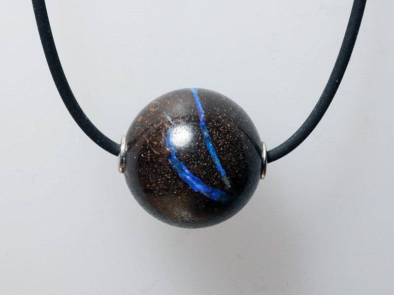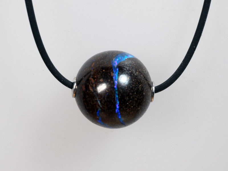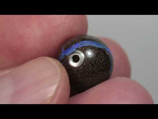 Perla di opale boulder australiano con venature dai colori di varie tonalità di blu. La chiusura del foro è in argento 925.