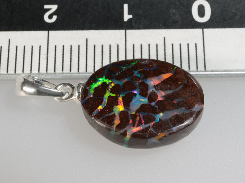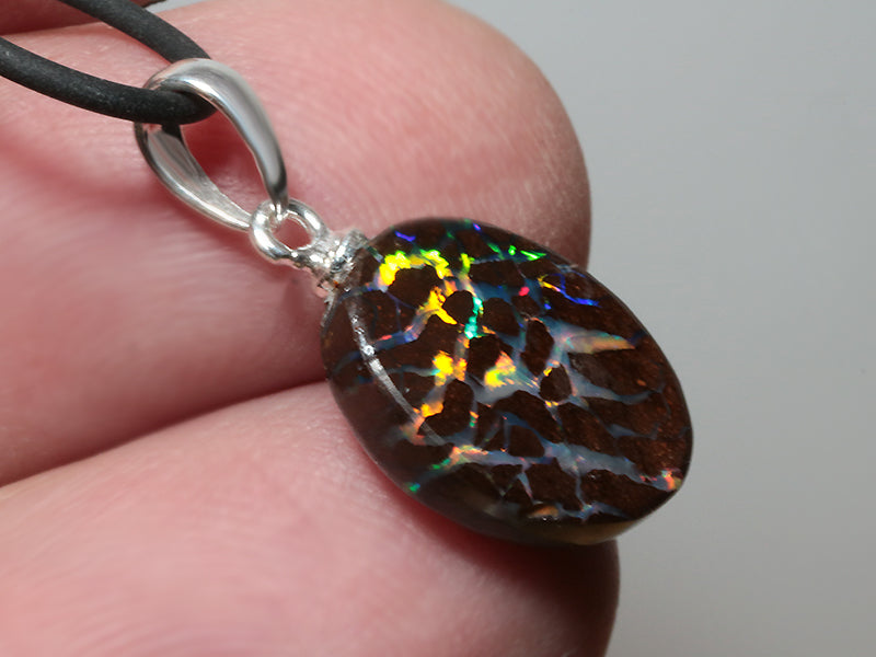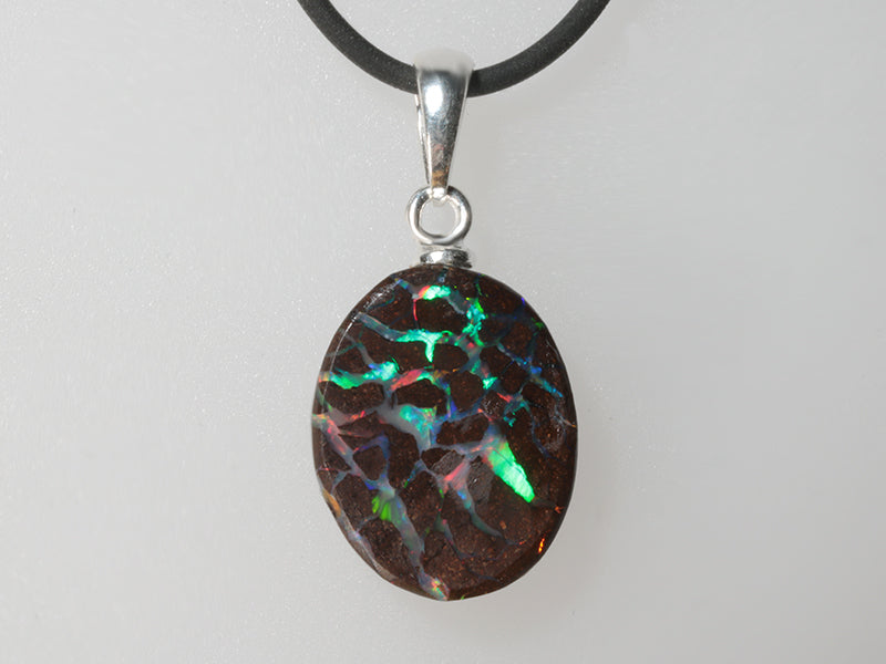 Pendente in argento 925 con opale boulder australiano, caratterizzato da affascinanti venature multicolore che catturano la luce con riflessi a volte elettrici.