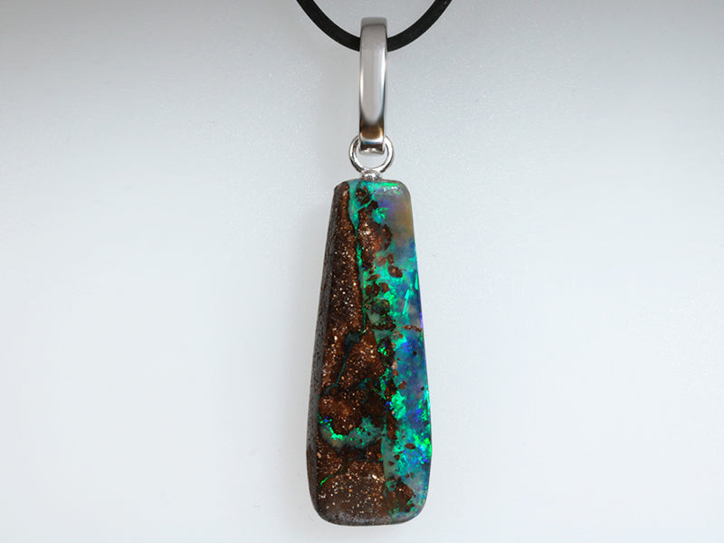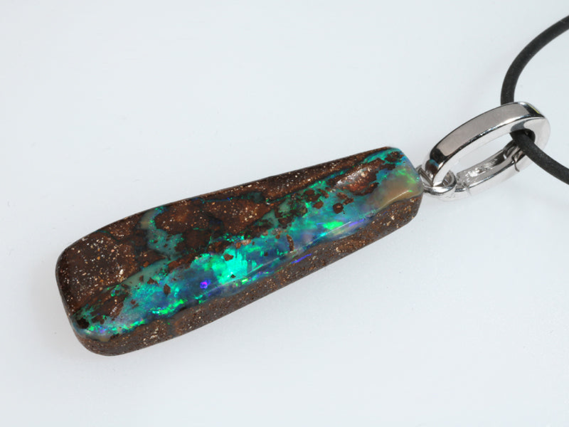 Bellissimo pendente che unisce l'eleganza dell'argento 925 con la straordinaria bellezza dell'opale boulder australiano. Questa gemma naturale cattura riflessi verdi e blu di notevole intensità, creando un gioco di luci unico e affascinante