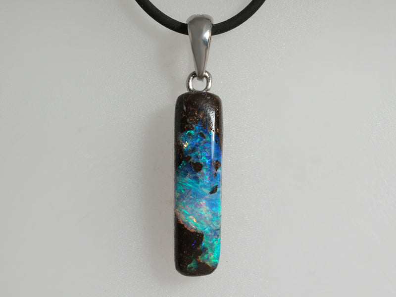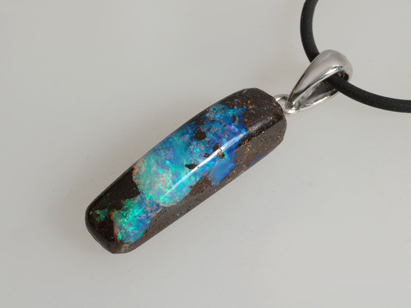 Opale boulder australiano caratterizzato da un affascinante gioco di riflessi in tonalità azzurre, verdi e blu che catturano la luce con ogni movimento. Realizzato in argento 925 e un design minimalista esalta la gemma senza compromessi, permettendo ai colori iridescenti di esprimere tutta la loro intensità