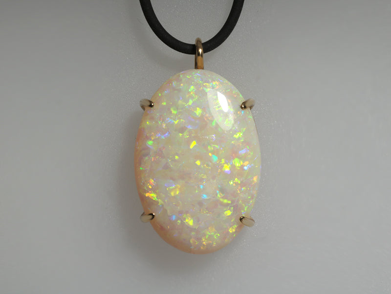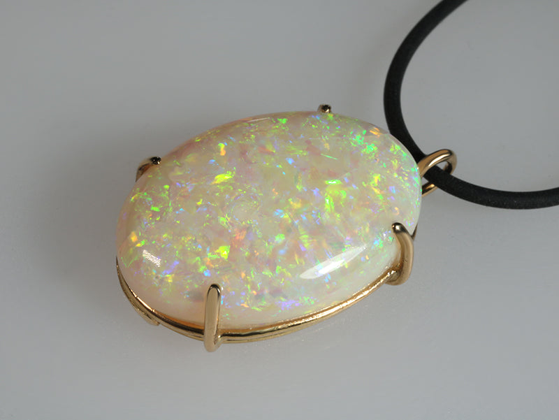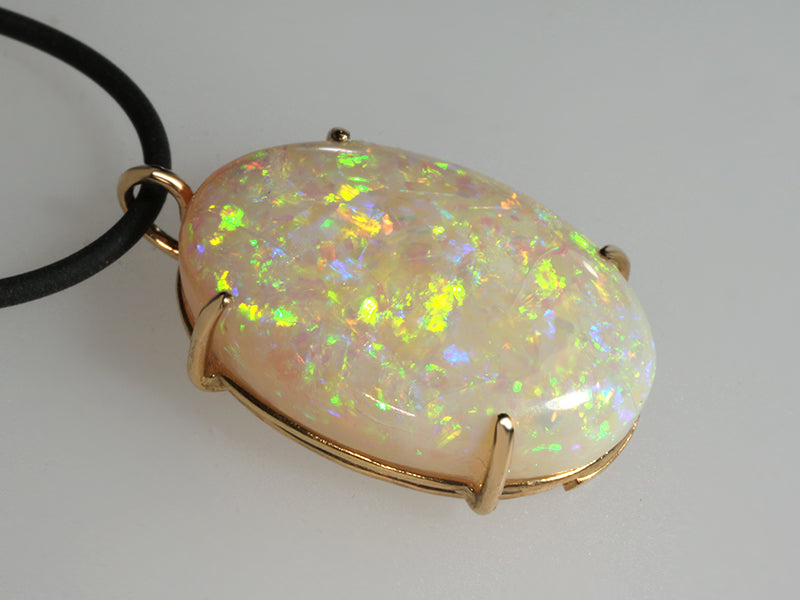 Pendente in oro 18k e bellissimo opale chiaro di alta qualità taglio ovale cabochon con colori ben definiti, una gemma dai riflessi brillanti.