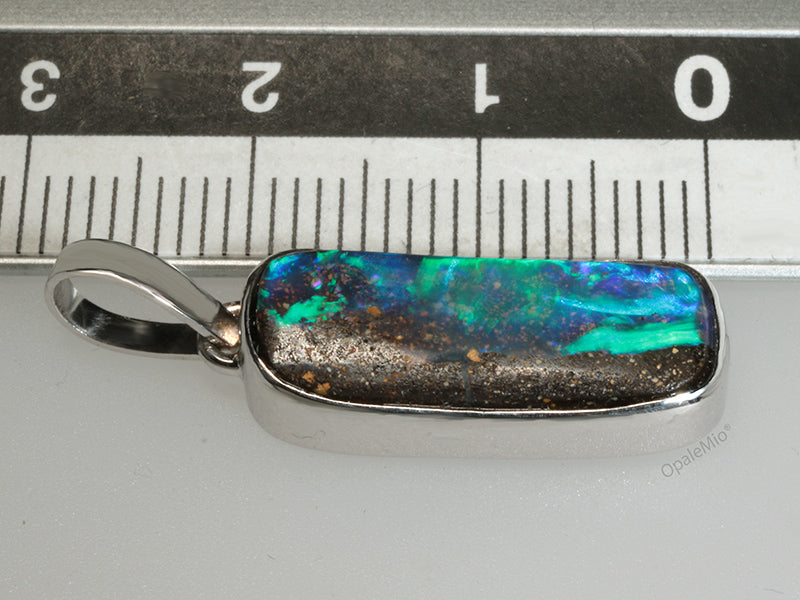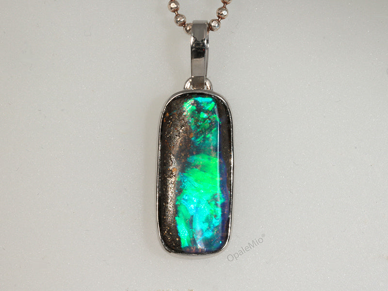 Pendente con opale boulder australiano dai riflessi estremamente brillanti e colori intensi verdi e blu. L'opale è incastonato in oro bianco 18k.