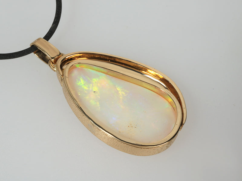 Pendente in oro 18k impreziosito da un opale chiaro che si distingue per i suoi colori brillanti e intensi, ideale per chi cerca eleganza e originalità in un accessorio sofisticato.