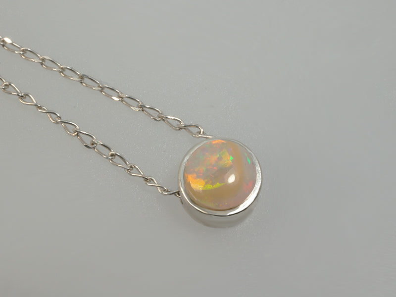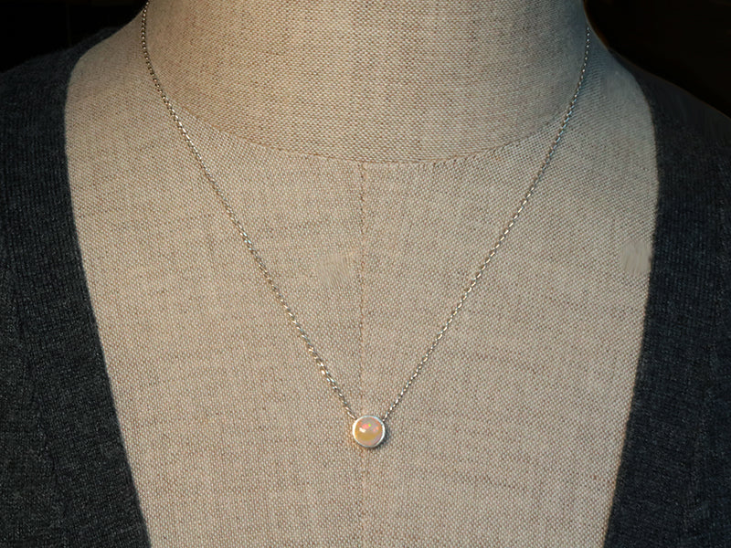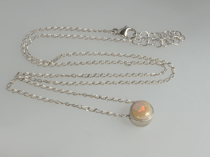 Pendente in argentium 935 punto luce con opale bianco che evidenzia uno splendido gioco di colori completo di collanina in argento 925 dalla lunghezza regolabile da 42 a 47 cm. L'argentium 935 è una qualità superiore di argento, ipoallergenico, non soggetto a ossidazione, di altissima resistenza.