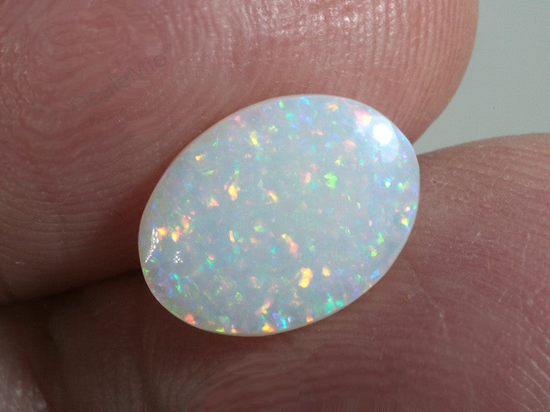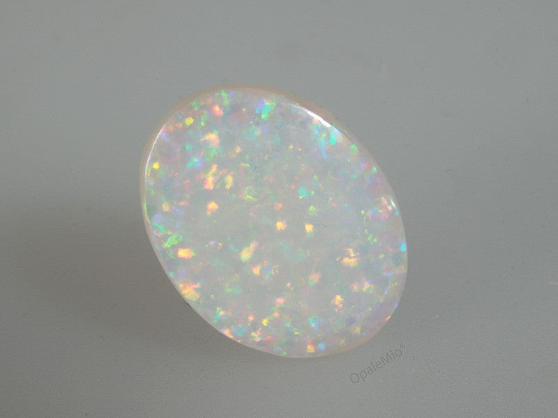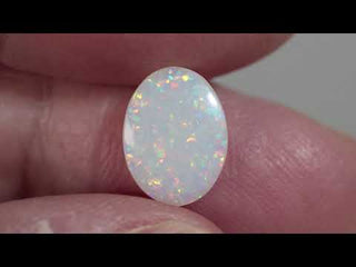 Opale bianco taglio ovale con doppio pattern e un'ampia varietà di puntini colorati che brillano sulla gemma.