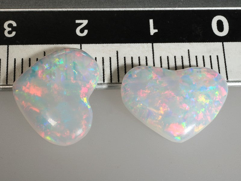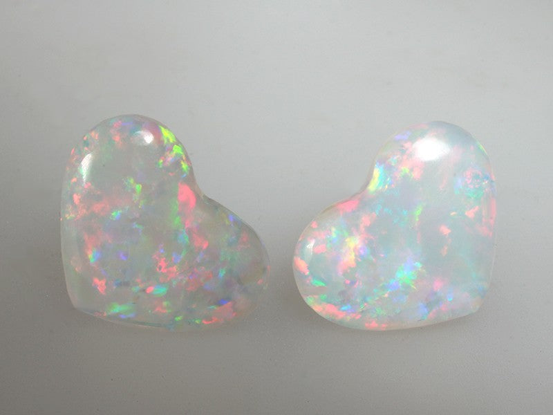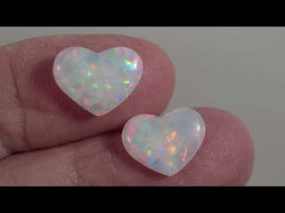 Bellissima coppia di opali bianchi traslucenti taglio cuore di ottima qualità con un affascinante gioco di colori che illuminano le gemme.