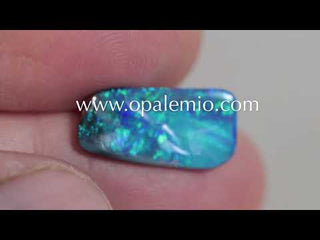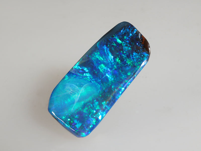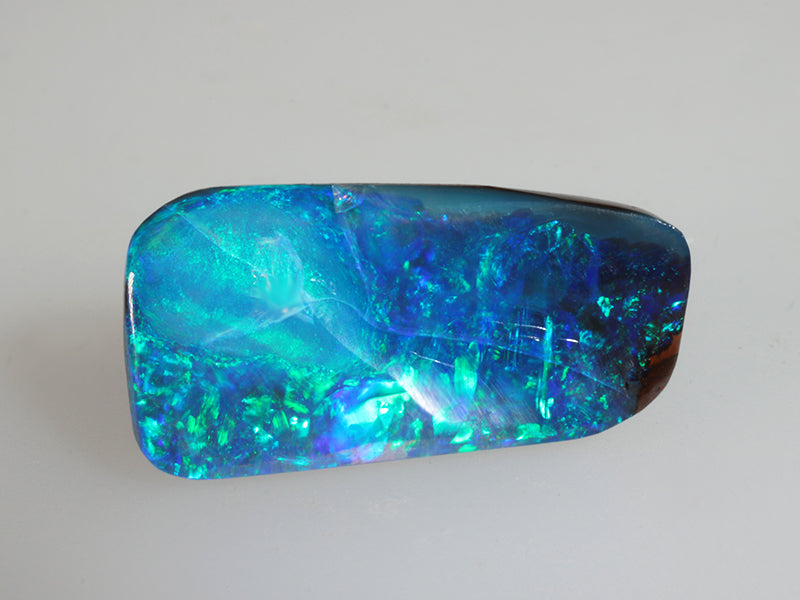 Opale boulder australiano taglio libero dai riflessi molto brillanti e colori vivi che sprigionano varie tonalità di blu e verde.