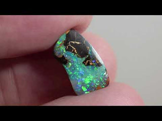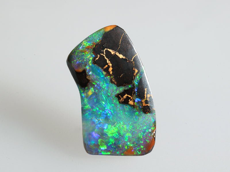 Delizioso opale boulder taglio libero con intensi riflessi verdi e blu che emergono con brillantezza, offrendo una vivace profondità cromatica tipica delle gemme di alta qualità