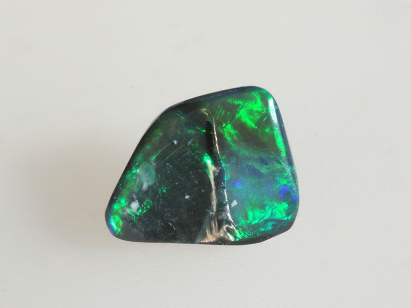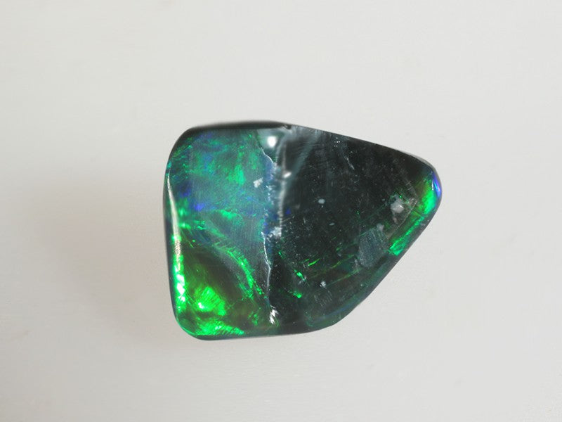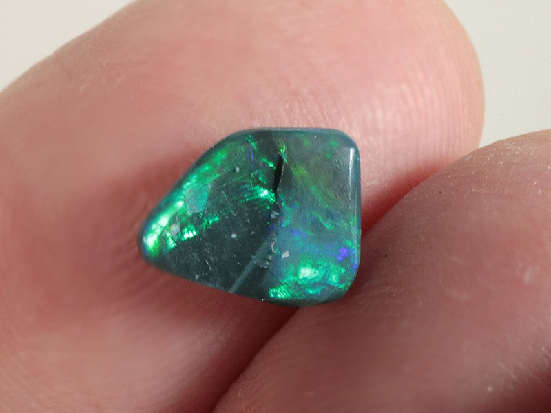 Piccolo opale nero australiano dai riflessi brillanti che si evidenziano con il movimento della gemma e colori che passano dal verde intenso al blu