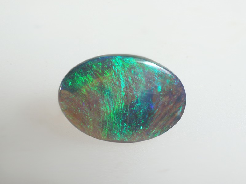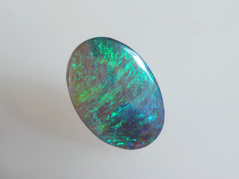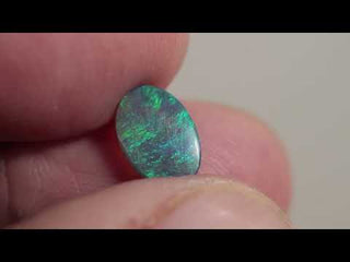 Piccolo opale nero crystal australiano taglio ovale con intensi e luminosi riflessi verdi e blu.