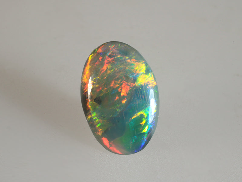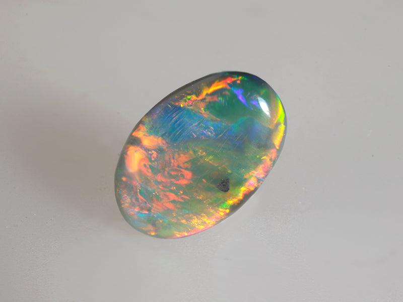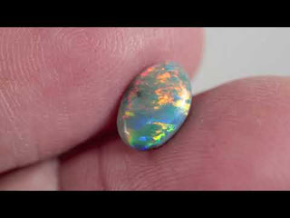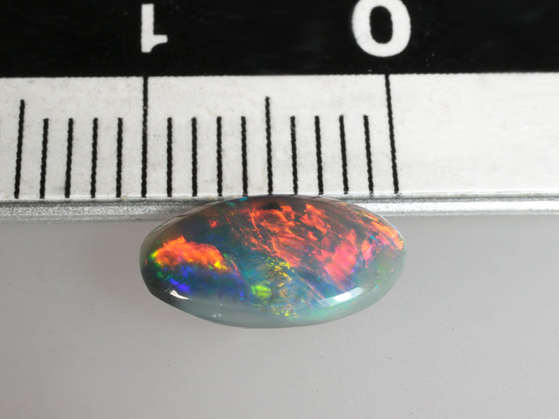Opale nero australiano taglio ovale cabochon basso dai riflessi brillanti e un bel gioco di colori che scorrono sulla gemma dove il rosso è la tinta dominante.