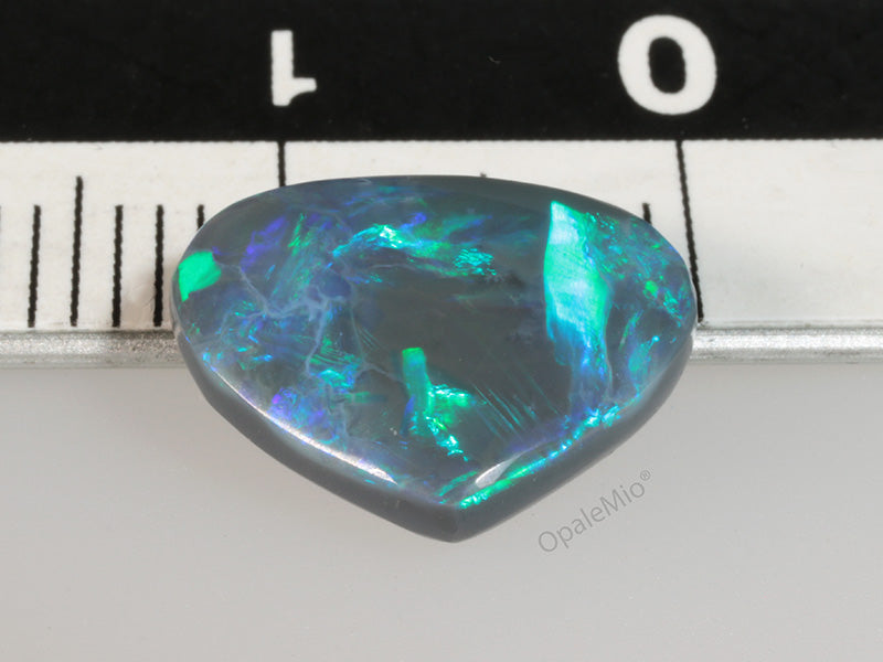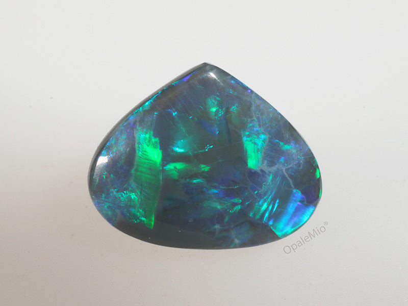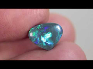 Opale nero australiano taglio goccia dai riflessi brillanti che si evidenziano con il movimento della gemma e colori che passano dal verde intenso all'azzurro e blu.