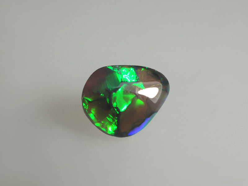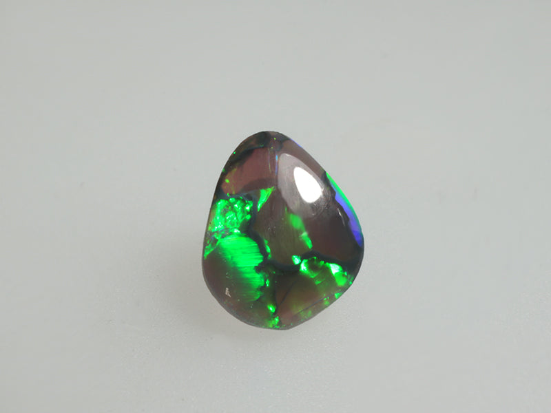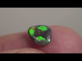 Piccolo opale nero crystal australiano in forma libera con affascinanti riflessi verdi luminosissimi che danzano dinamicamente sulla superficie della gemma. Ideale per un anello o appassionati di mineralogia che ricercano esemplari con opalescenza pronunciata e tonalità cromatiche intense.