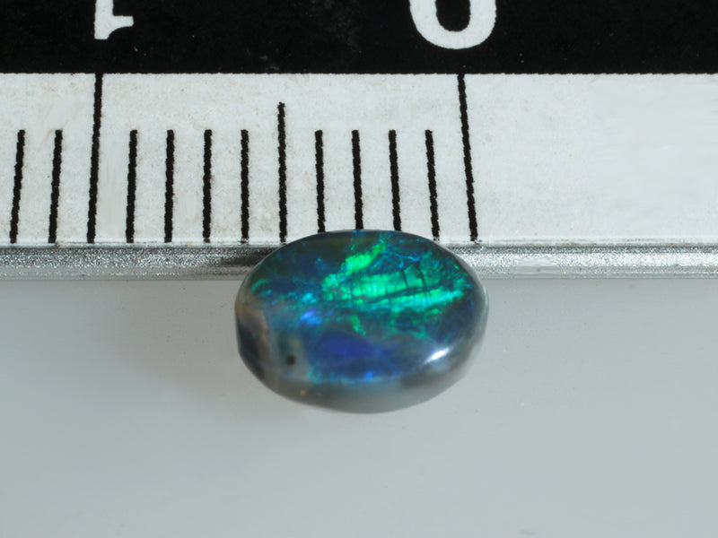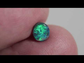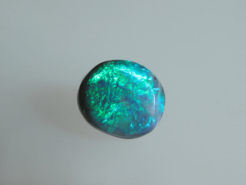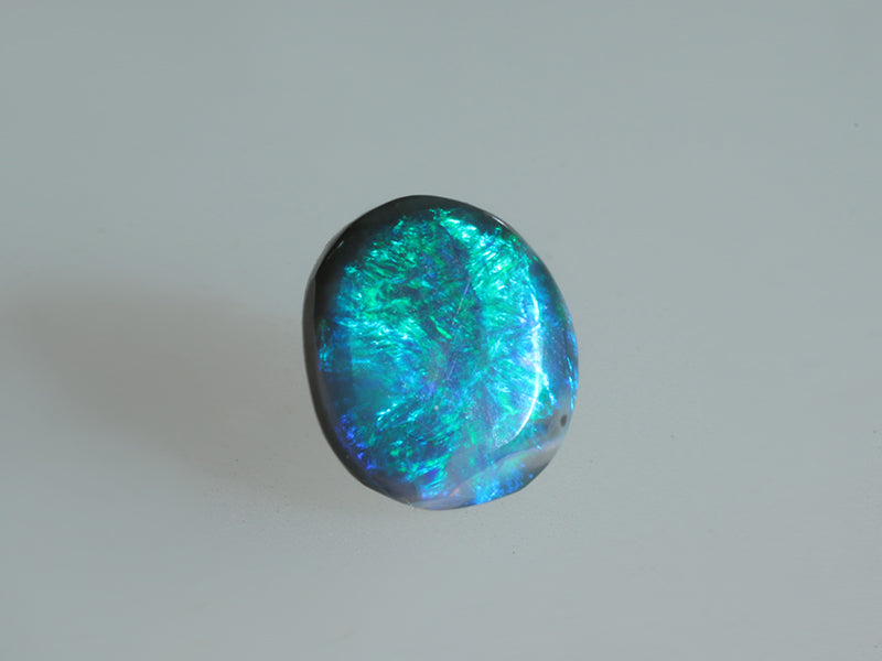 Piccolo opale nero australiano tagliato in forma ovale che cattura la luce con riflessi verdi e blu di straordinaria intensità. Una gemma versatile e perfetta per la creazione di gioielli punto luce