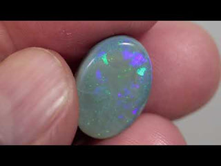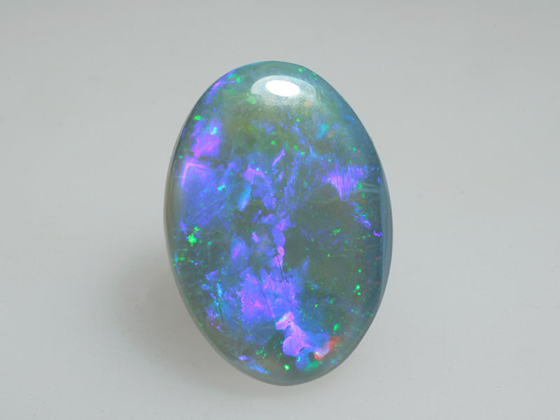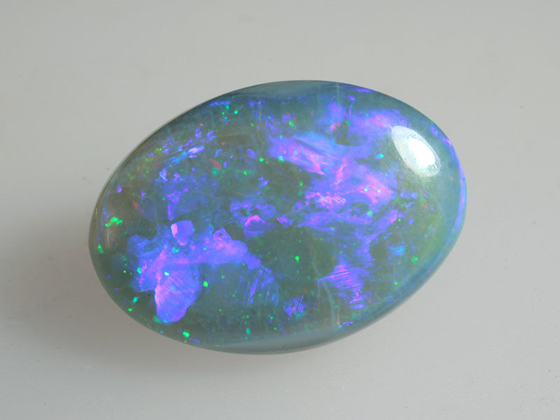 Splendido opale scuro australiano taglio ovale con doppio pattern dove tanti piccoli punti di luce colorati fanno da sottofondo a grandi riflessi blu intenso.