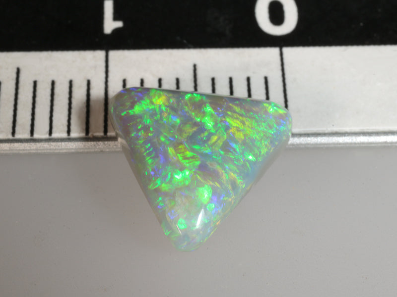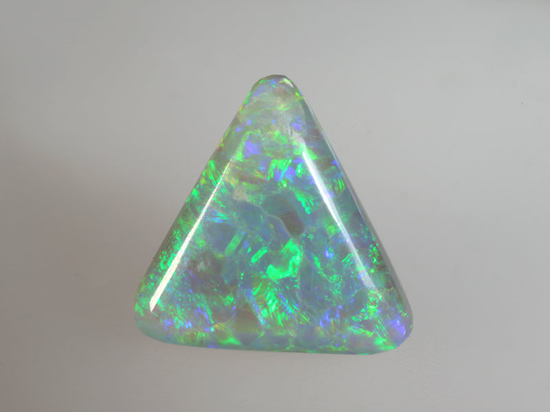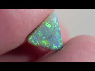 Bellissimo opale scuro australiano taglio triangolare con brillanti riflessi verdi e blu che si evidenziano con qualsiasi luce.