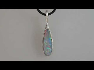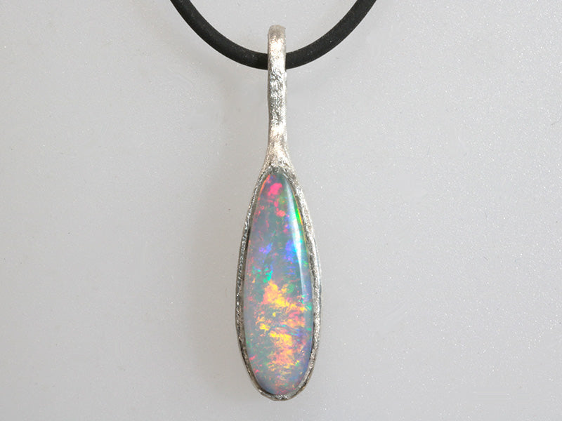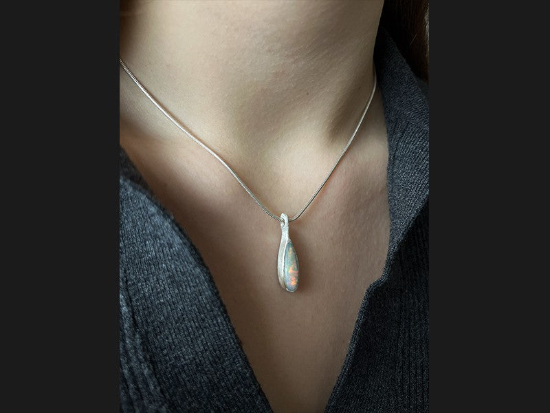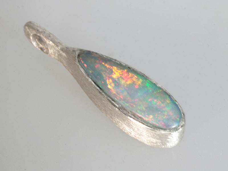 Pendente in Argentium 935 e opale chiaro taglio goccia che evidenzia uno splendido quanto brillante gioco di colori.