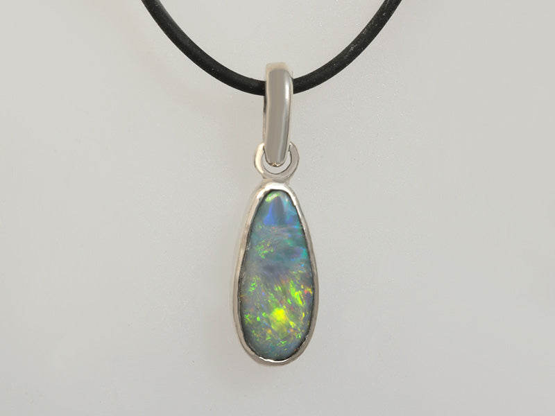 Pendente in argento 935 con opale australiano scuro dalle tonalità cromatiche intense e brillanti. Questo pezzo cattura la luce naturale rivelando giochi di colore affascinanti e mutevoli. La gemma incastonata in argento 935 argentium, creando un contrasto elegante tra il metallo luminoso e le profondità dell'opale.