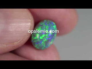 Bellissimo opale nero crystal australiano taglio ovale cabochon alto con riflessi verdi, blu molto e arancio molto brillanti e sempre ben evidenti sulla gemma