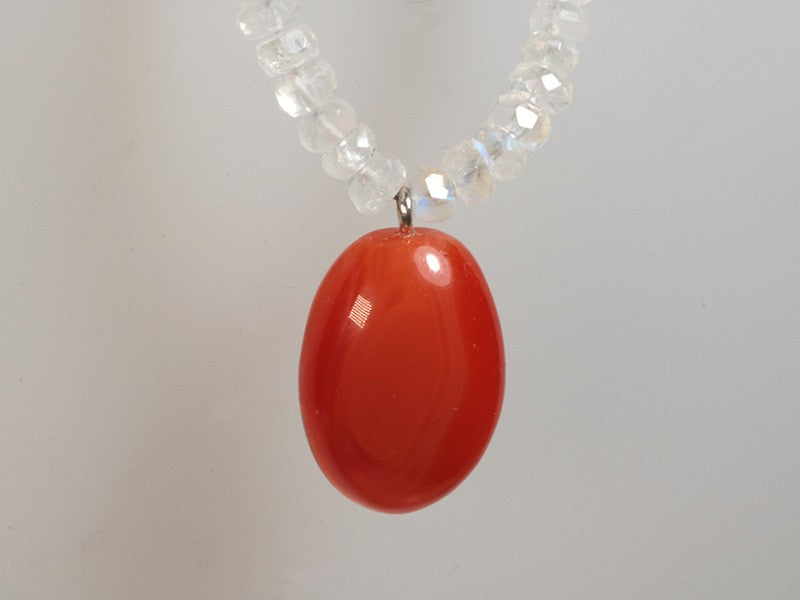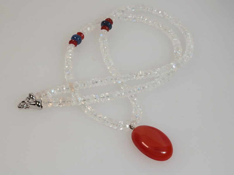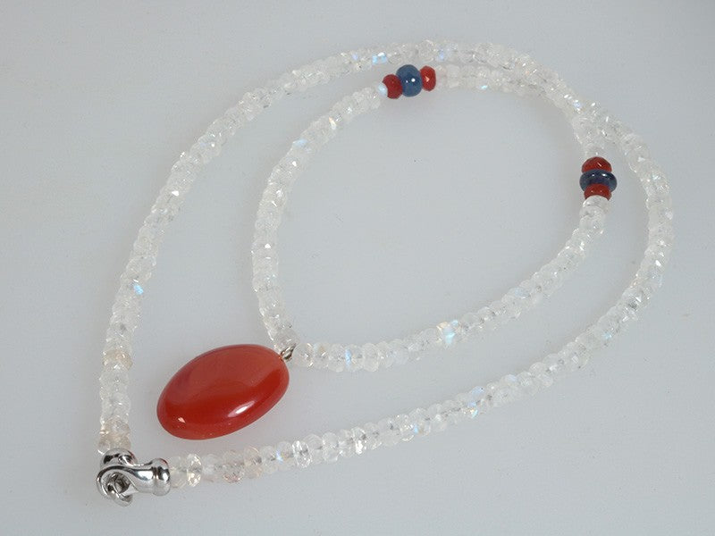 Collana composta con un opale di fuoco messicano centrale montato in un filo di labradoriti, inserti di opale di fuoco e zaffiri. Chiusura arg.925  - Lunghezza 43 cm.